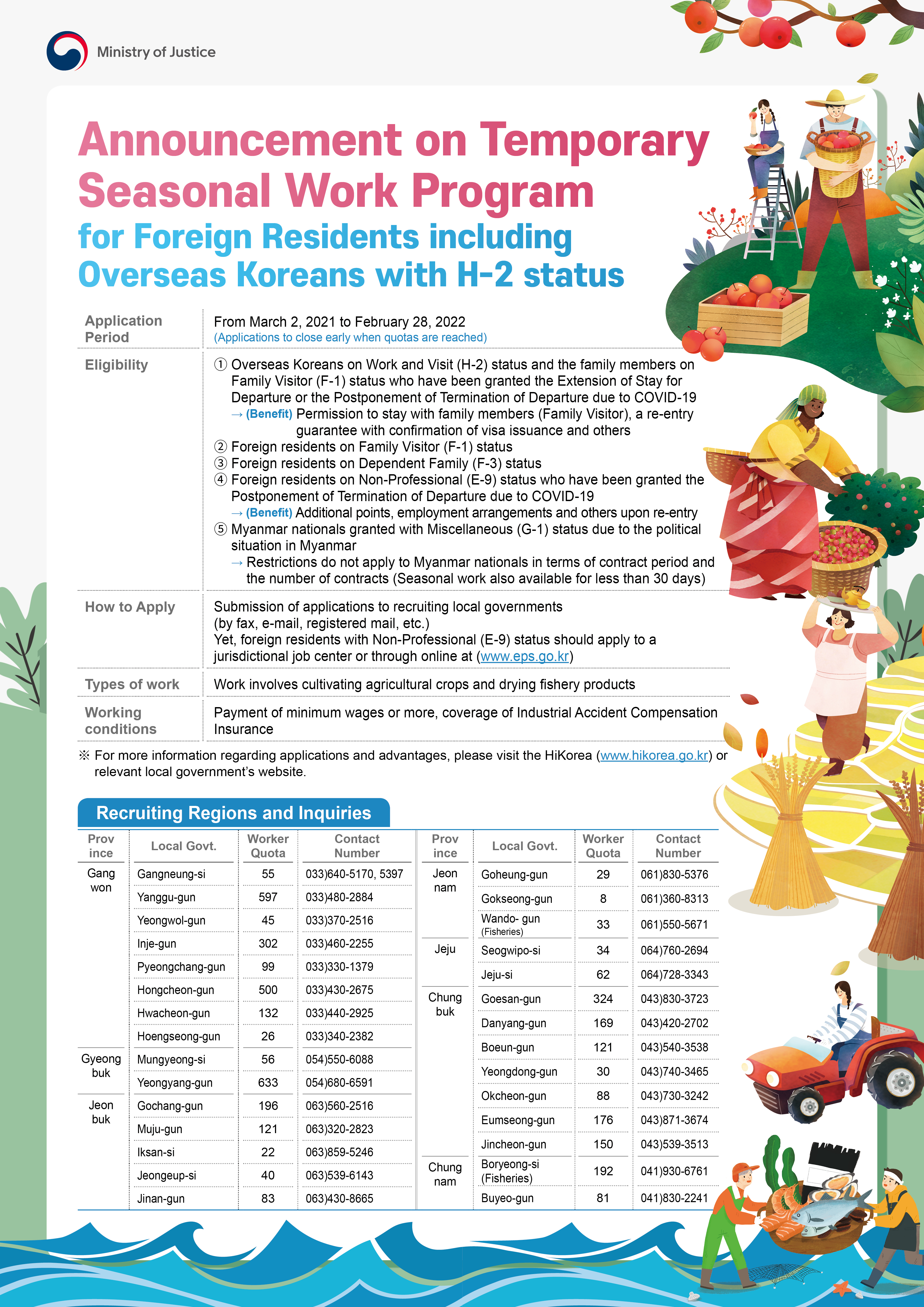 The Seasonal Worker Program in Gangwon Province assists farmers in the agricultural sector to fill labor shortages during busy farming season by allowing legal hiring of foreign workers for a certain period of time.